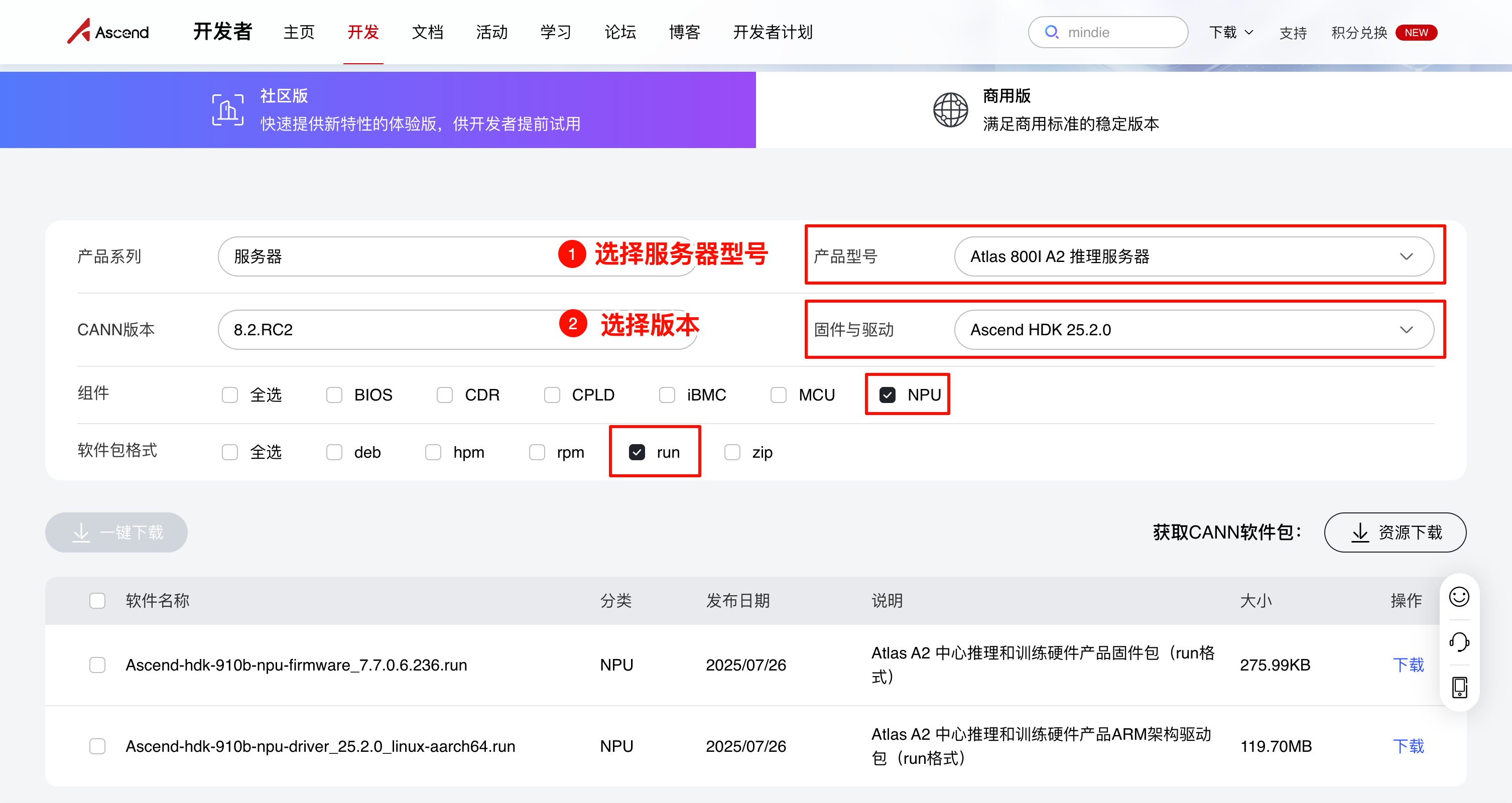 驱动与固件下载页面(下载时需登录):https://www.hiascend.com/hardware/firmware-drivers/community