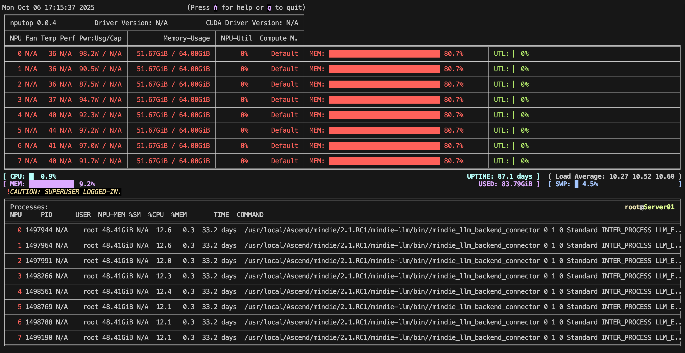 使用npu-smi info工具查看显卡信息没有那么方便,使用[nputop](https://github.com/youyve/nputop)这个工具可以实时的查看显卡的资源使用情况