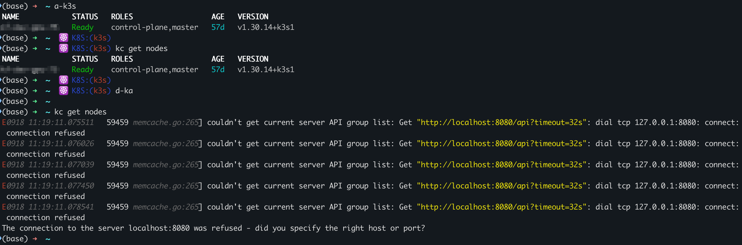 ka: 指定KUBECONFIG变量为指定的 kubeconfig 文件,并给 k9s 指定一下使用的 kubeconfig,然后输出一下节点信息a-xxx: 封装了ka函数,通过xxx指定环境并传给ka函数,实现通过执行a-xxx切换到xxx环境的功能。比如在终端执行a-dev即可切换到dev环境
